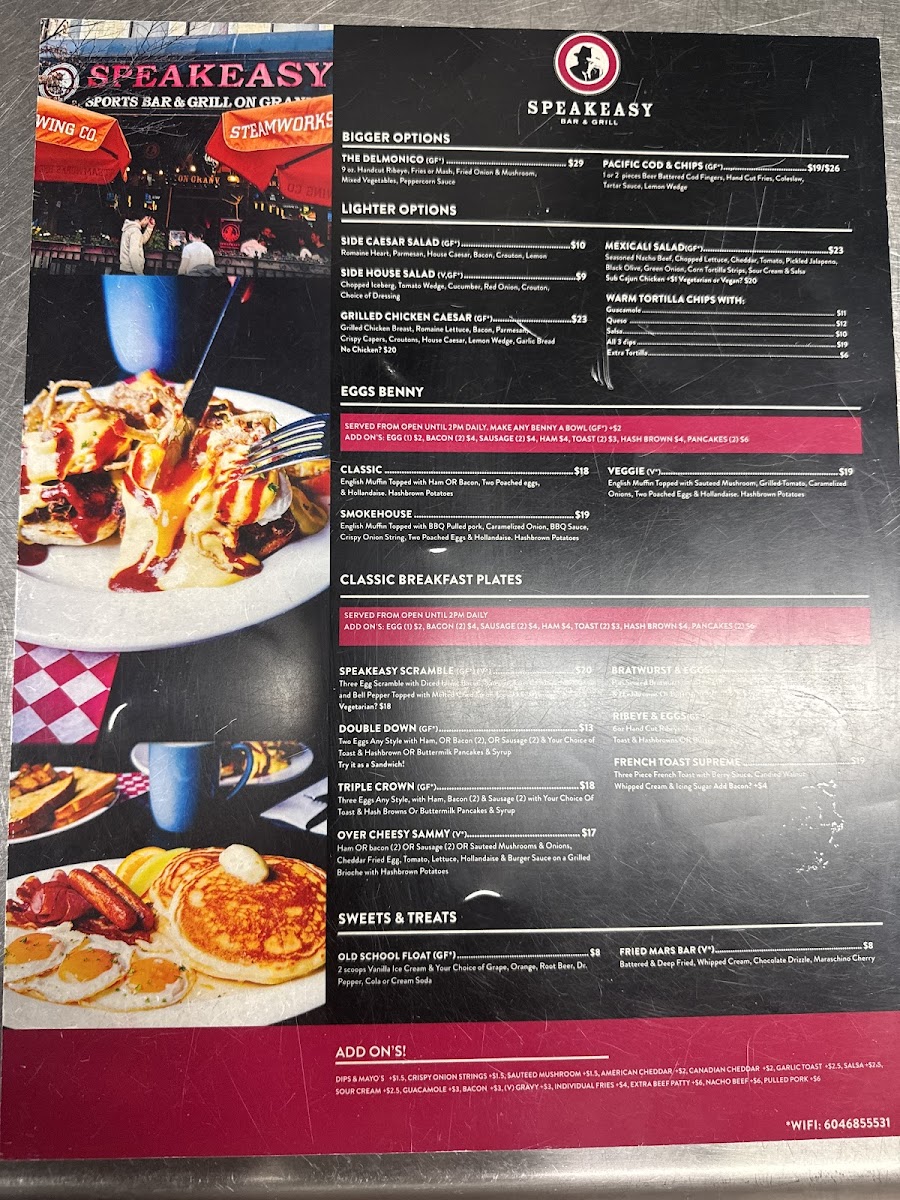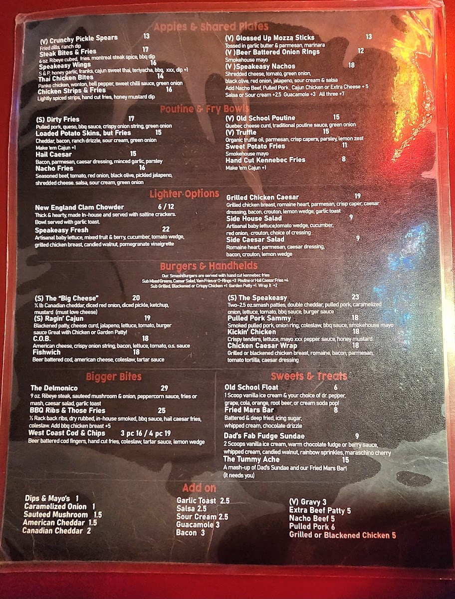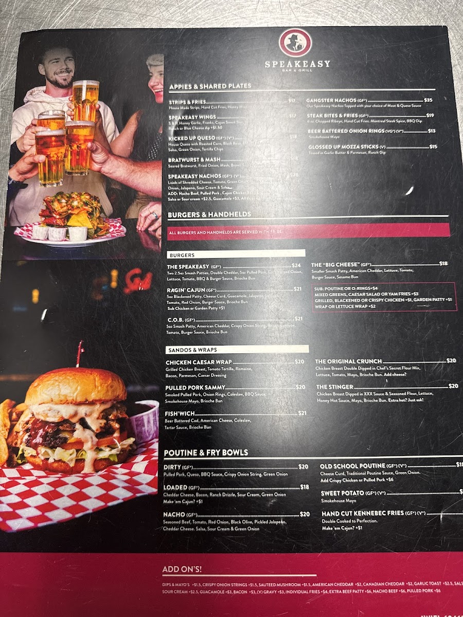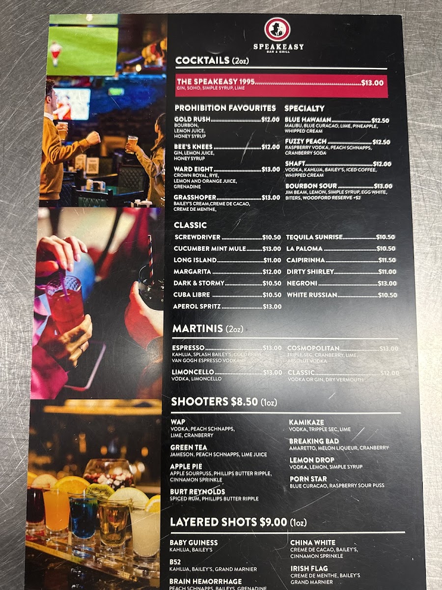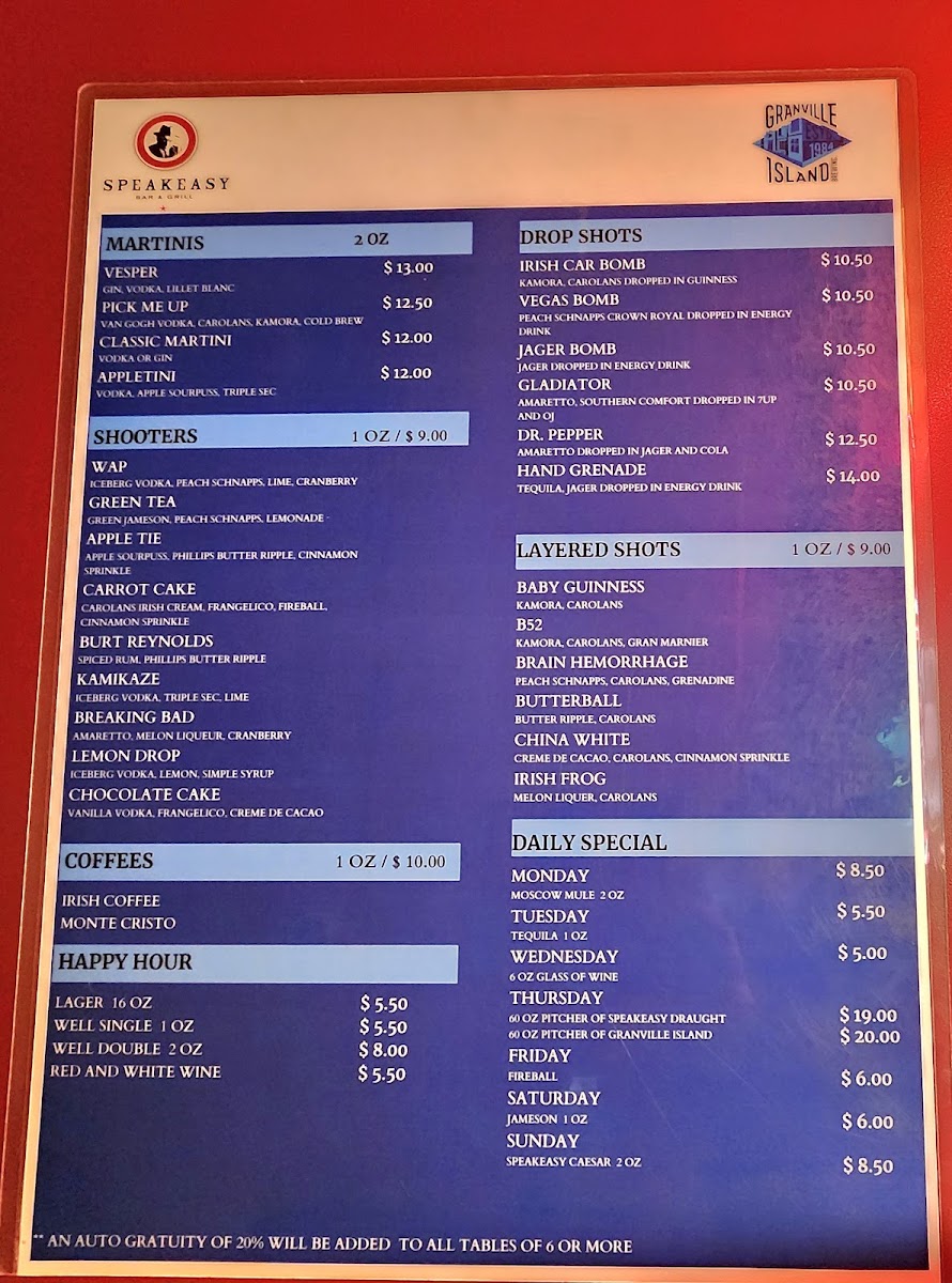 The menu at Speakeasy on Granville offers a balanced selection of approachable bar & grill fare that feels right at home whether you're stopping in for a laid-back lunch, grabbing a casual dinner, or unwinding with friends during happy hour. You’ll find classic comfort dishes like hearty Fish and Chips and the popular C O B Burger alongside shareable bites such as Spicy Thai Chicken Bites and Crispy Calamari—perfect for pairing with a thoughtfully curated craft beer or a refreshing cocktail like the Blue Hawaiian or Mojito.